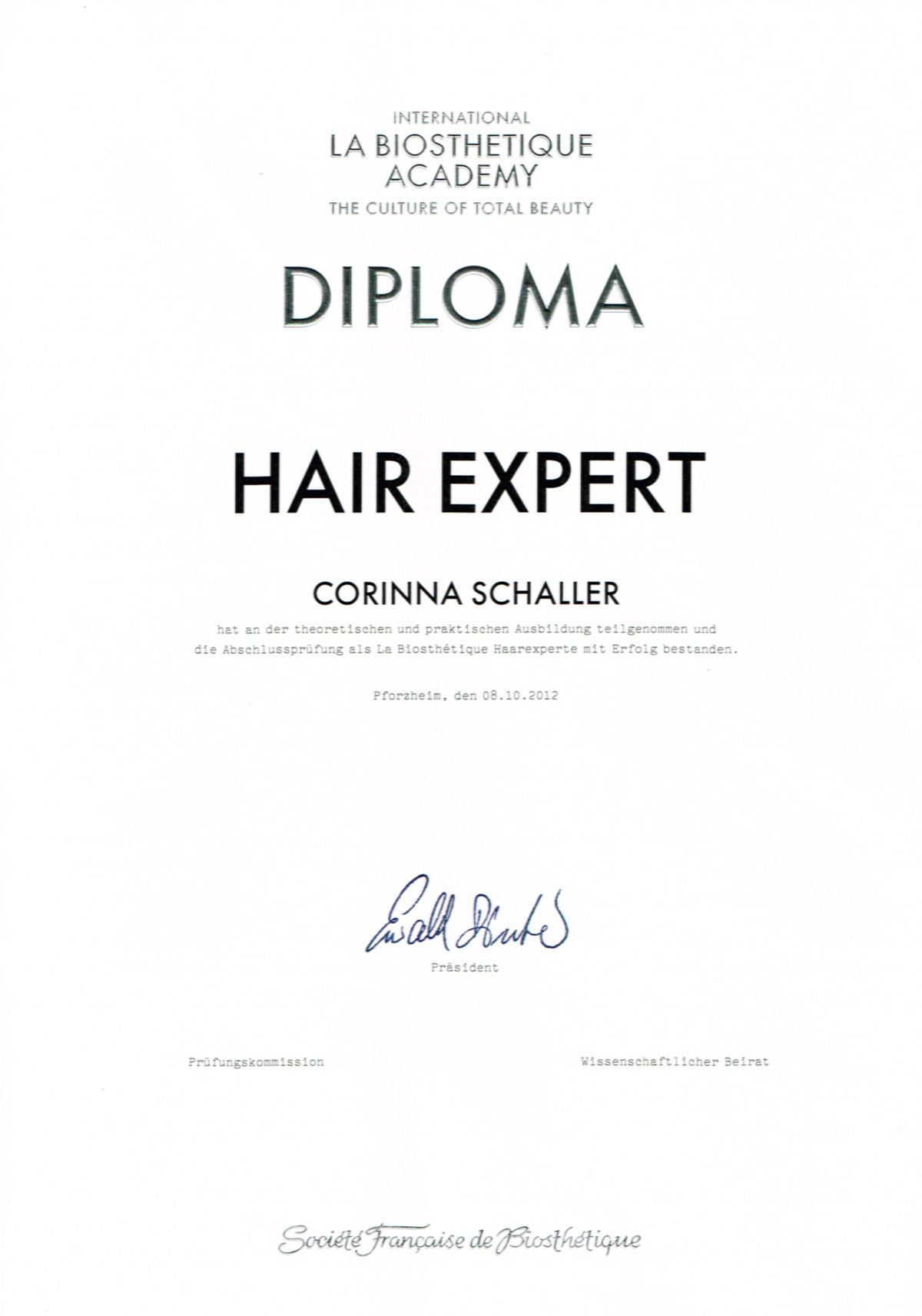Um das Diplom zu erhalten, musste Corinna Schaller sowohl in einer theoretischen als auch praktischen Prüfung unter Beweis stellen, dass sie über fundierte Diagnose- und Beratungskenntnisse sowie die professionelle Umsetzung aller La Biostetique Haar- und Kopfhautpflege-Dienstleistungen verfügt.